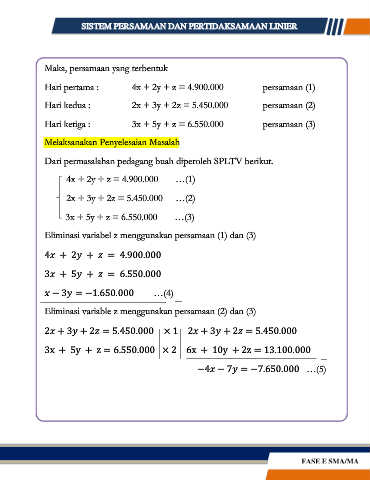Hari ketiga : 3x + 5y + z = 6.550.000 persamaan (3)
