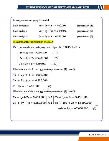 Hari ketiga : 3x + 5y + z = 6.550.000 persamaan (3)