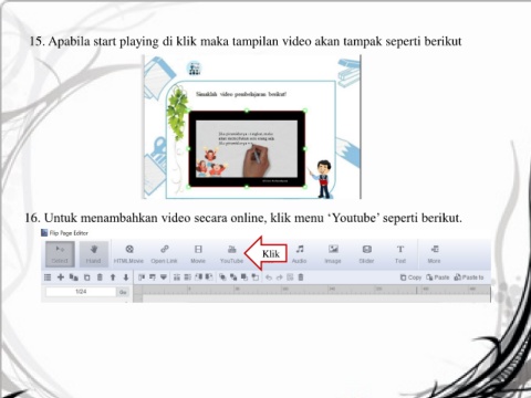 15. Apabila start playing di klik maka tampilan video akan tampak seperti berikut 16. Untuk menambahkan video secara online, klik menu ‘Youtube’ seperti berikut. Klik