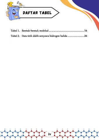 Tabel 1. Bentuk-bentuk molekul ..................................................... 16 Tabel 2. Data titik didih senyawa hidrogen halida ......................... 26 iv
