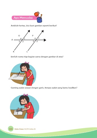 Ambilah kertas, lalu buat gambar seperti berikut! O P 4 1 4 1 A 3 2 3 2 K L Berilah nama tiap bagian sama dengan gambar di atas! Gunting sudut sesuai dengan garis. Berapa sudut yang kamu hasilkan? 120 Buku Siswa SD/MI Kelas IV
