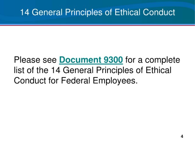 14 General Principles of Ethical Conduct Please see Document 9300 for a complete list of the 14 General Principles of Ethical Conduct for Federal Employees. 4