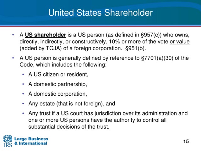 • A US shareholder is a US person (as defined in §957(c)) who owns,