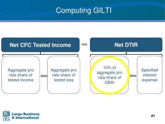 Computing GILTI 4 Net CFC less Net DTIR Tested Income 10% of Aggregate pro Aggregate pro aggregate pro Specified rata share of less rata share of rata share of less interest tested income tested loss expense QBAI 41