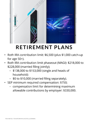 - Roth IRA contribution limit: $6,500 (plus $1,000 catch-up