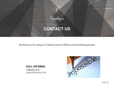 CONTACT US We thank you for using our Training Guide to fulfill your Cloud learning process CALL OR EMAIL 1.469.910.7213 support@trainbyus.com Page: 43