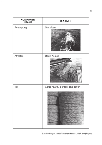 21 KOMPONEN B A H A N UTAMA Pelampung Sterofoam Atraktor Daun Kelapa Tali Splite fibres / Serabut pita pecah Buku Ajar Rumpon Laut Dalam dengan Atraktor Limbah Jaring Payang