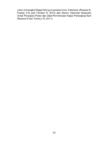 untuk menangkal illegal fishing di perairan timur Indonesia (Rosana N, Prasita V.Dj and Tambun R, 2014) dan Sistem Informasi Geografis Untuk Penyajian Posisi dan Data Pemeriksaan Kapal Penangkap Ikan (Rosana N dan Tambun R, 2011). 33