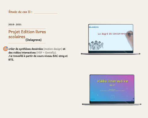 Étude de cas II : 2019- 2021 Projet Edition livres scolaires (Delagrave) créer de synthèses dessinées (motion design) et des vidéos interactives (H5P + Genially). J’ai travaillé à partir de cours niveau BAC stmg et BTS.