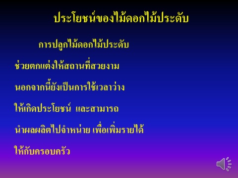 ์ ้ ้ ประโยชนของไมดอกไมประดับ ้ ้ การปลูกไมดอกไมประดับ ่ ้ ่ ชวยตกแตงใหสถานที่สวยงาม ้ นอกจากนี้ยังเปนการใชเวลาวาง ็ ่ ์ ้ ใหเกิดประโยชน และสามารถ ่ ้ นาผลผลิตไปจ าหนาย เพื่อเพิ่มรายได ใหกับครอบครว ้ ั