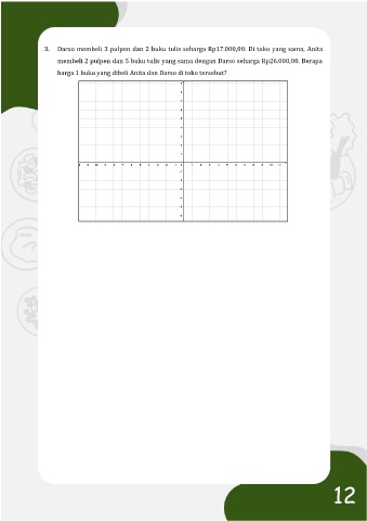 3. Darso membeli 3 pulpen dan 2 buku tulis seharga Rp17.000,00. Di toko yang sama, Anita membeli 2 pulpen dan 5 buku tulis yang sama dengan Darso seharga Rp26.000,00. Berapa harga 1 buku yang dibeli Anita dan Darso di toko tersebut? 12