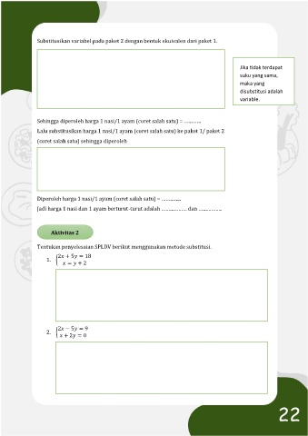Jadi harga 1 nasi dan 1 ayam berturut-turut adalah ……………… dan ……………..
