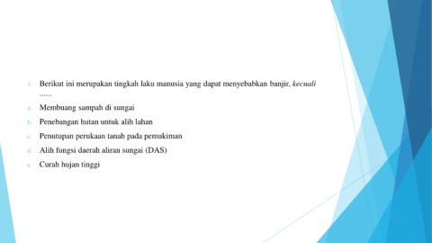 1. Berikut ini merupakan tingkah laku manusia yang dapat menyebabkan banjir, kecuali
