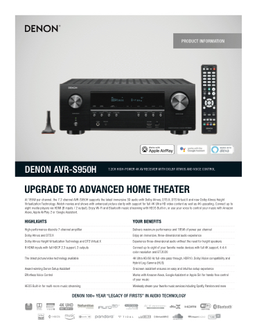 At 185W per channel, the 7.2 channel AVR-S950H supports the latest immersive 3D audio with Dolby Atmos, DTS:X, DTS Virtual:X and new Dolby Atmos Height Virtualization Technology. Watch movies and shows with enhanced picture clarity with support for full 4K Ultra HD video content as well as 4K upscaling. Connect up to eight media players via HDMI (8 inputs / 2 output). Enjoy Wi-Fi and Bluetooth music streaming with HEOS Built-in, or use your voice to control your music with Amazon Alexa, Apple AirPlay 2 or Google Assistant.