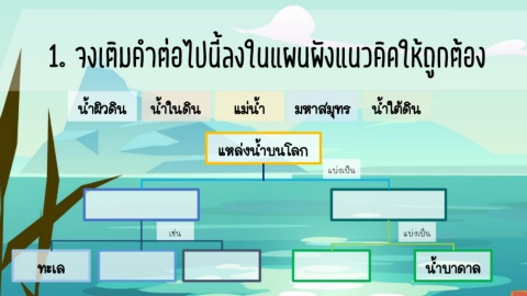 1. จงเติมค้าต่อไปนี้ลงในแผนผังแนวคิดให้ถูกต้อง แบ่งเป็น เช่น แบ่งเป็น