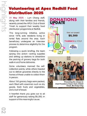 Volunteering at Apex Redhill Food Distribution 2025 highlights Presenting the cheque to Club President of Apex Club of Bukit Timah, Ms Evelyn Ong 02