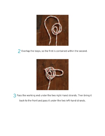 2 Overlap the loops, so the first is contained within the second. 3 Pass the working end under the two right-hand strands. Then bring it back to the front and pass it under the two left-hand strands.