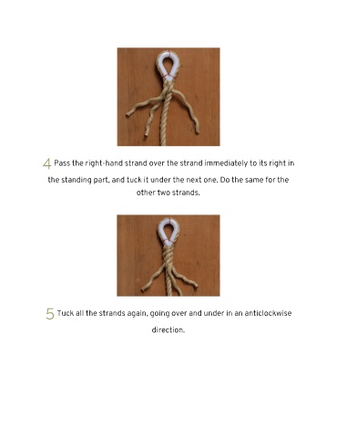 4 Pass the right-hand strand over the strand immediately to its right in the standing part, and tuck it under the next one. Do the same for the other two strands. 5 Tuck all the strands again, going over and under in an anticlockwise direction.