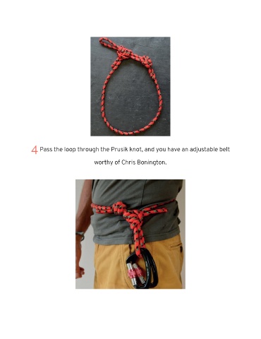 4 Pass the loop through the Prusik knot, and you have an adjustable belt worthy of Chris Bonington.