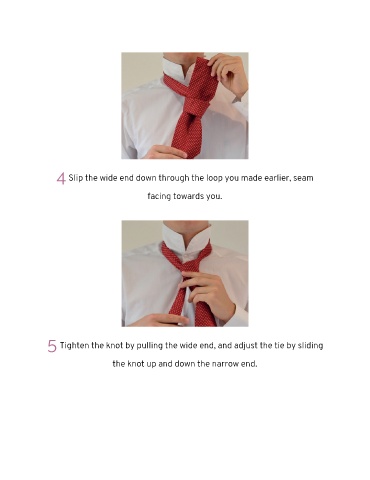 4 Slip the wide end down through the loop you made earlier, seam facing towards you. 5 Tighten the knot by pulling the wide end, and adjust the tie by sliding the knot up and down the narrow end.