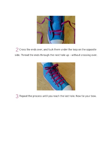 2 Cross the ends over, and tuck them under the loop on the opposite side. Thread the ends through the next hole up – without crossing over. 3 Repeat the process until you reach the last hole. Now tie your bow.