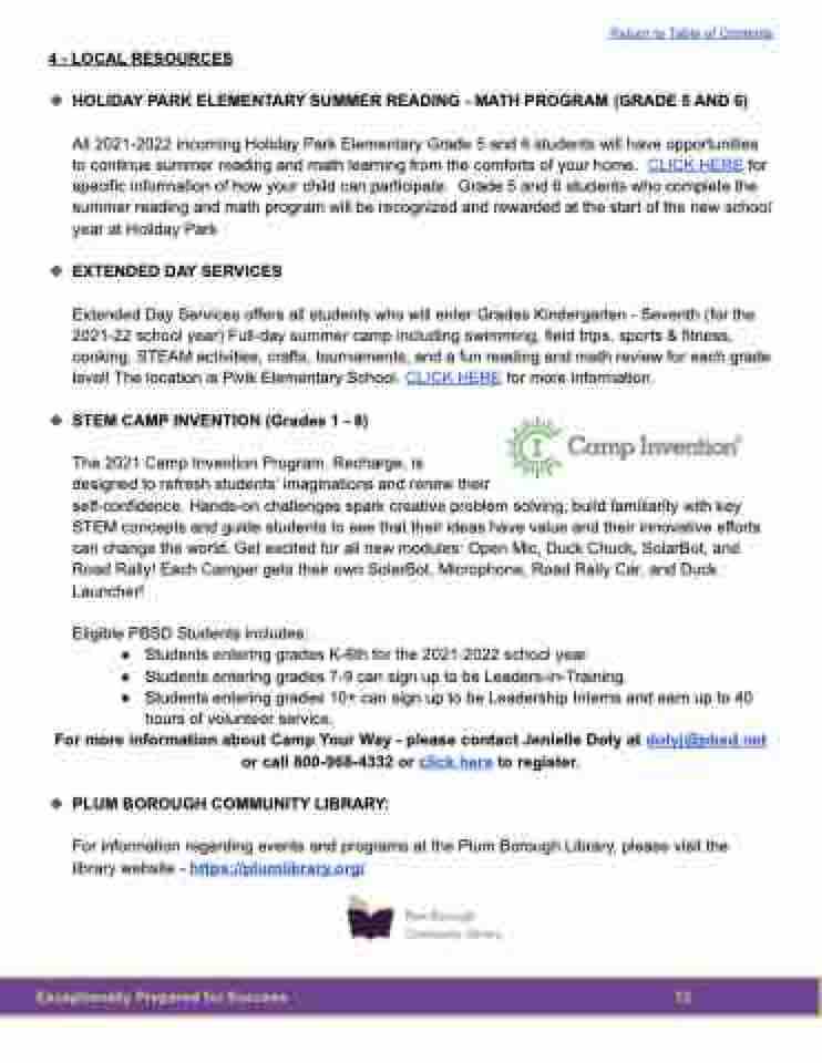 All 2021-2022 incoming Holiday Park Elementary Grade 5 and 6 students will have opportunities to continue summer reading and math learning from the comforts of your home. CLICK HERE for specific information of how your child can participate. Grade 5 and 6 students who complete the summer reading and math program will be recognized and rewarded at the start of the new school year at Holiday Park