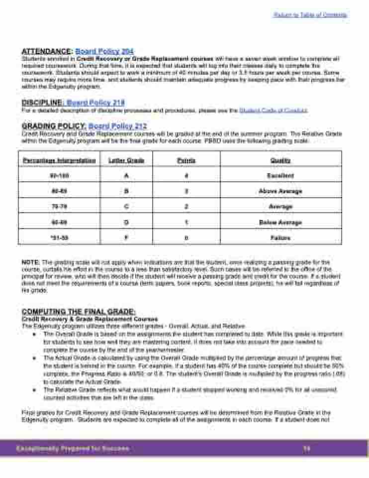 Credit Recovery and Grade Replacement courses will be graded at the end of the summer program. The Relative Grade within the Edgenuity program will be the final grade for each course. PBSD uses the following grading scale:
