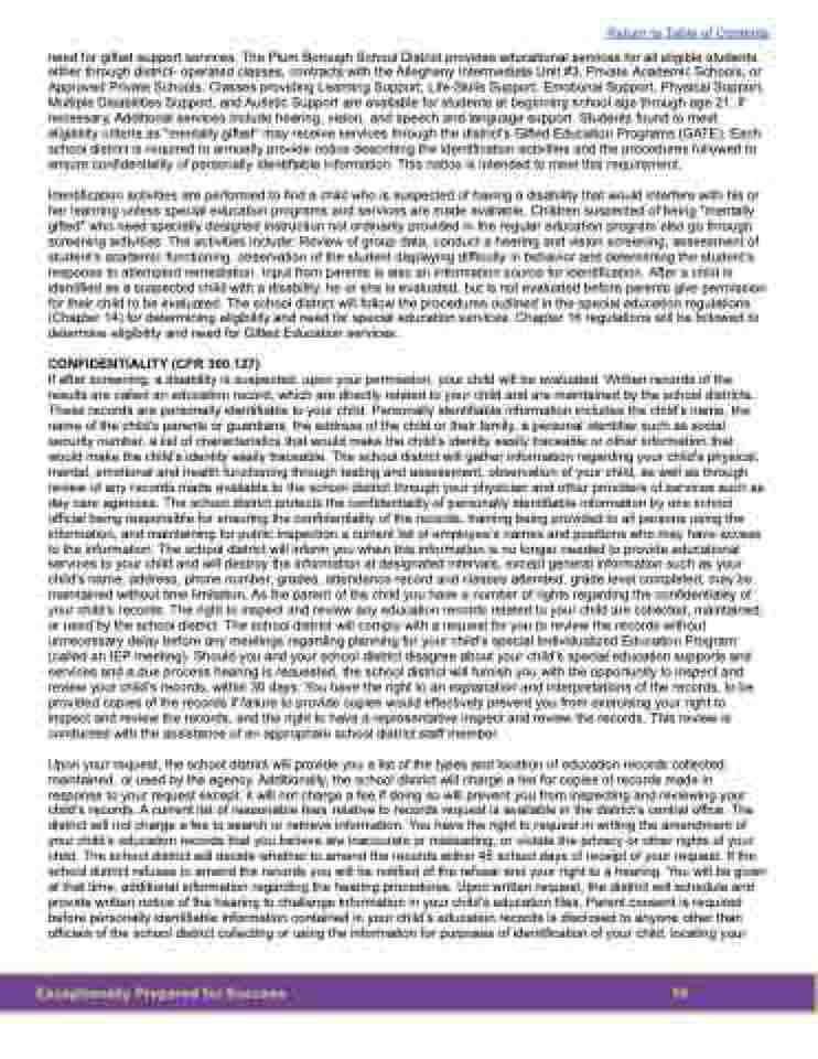 need for gifted support services. The Plum Borough School District provides educational services for all eligible students either through district- operated classes, contracts with the Allegheny Intermediate Unit #3, Private Academic Schools, or Approved Private Schools. Classes providing Learning Support, Life-Skills Support, Emotional Support, Physical Support, Multiple Disabilities Support, and Autistic Support are available for students at beginning school age through age 21, if necessary. Additional services include hearing, vision, and speech and language support. Students found to meet eligibility criteria as "mentally gifted" may receive services through the district's Gifted Education Programs (GATE). Each school district is required to annually provide notice describing the identification activities and the procedures followed to ensure confidentiality of personally identifiable information. This notice is intended to meet this requirement.