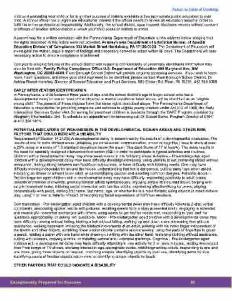Complaints alleging failures of the school district with regard to confidentiality of personally identifiable information may also be filed with: Family Policy Compliance Office U.S. Department of Education 400 Maryland Ave, SW Washington, DC 20202-4605. Plum Borough School District will provide ongoing screening services. If you wish to learn more, have questions, or believe your child may need to be identified, please contact Plum Borough School District, Dr. Ashlea Rineer-Hershey, Director of Special Education and Pupil Services, 900 Elicker Rd, Plum, PA 15239, 412.798.6368