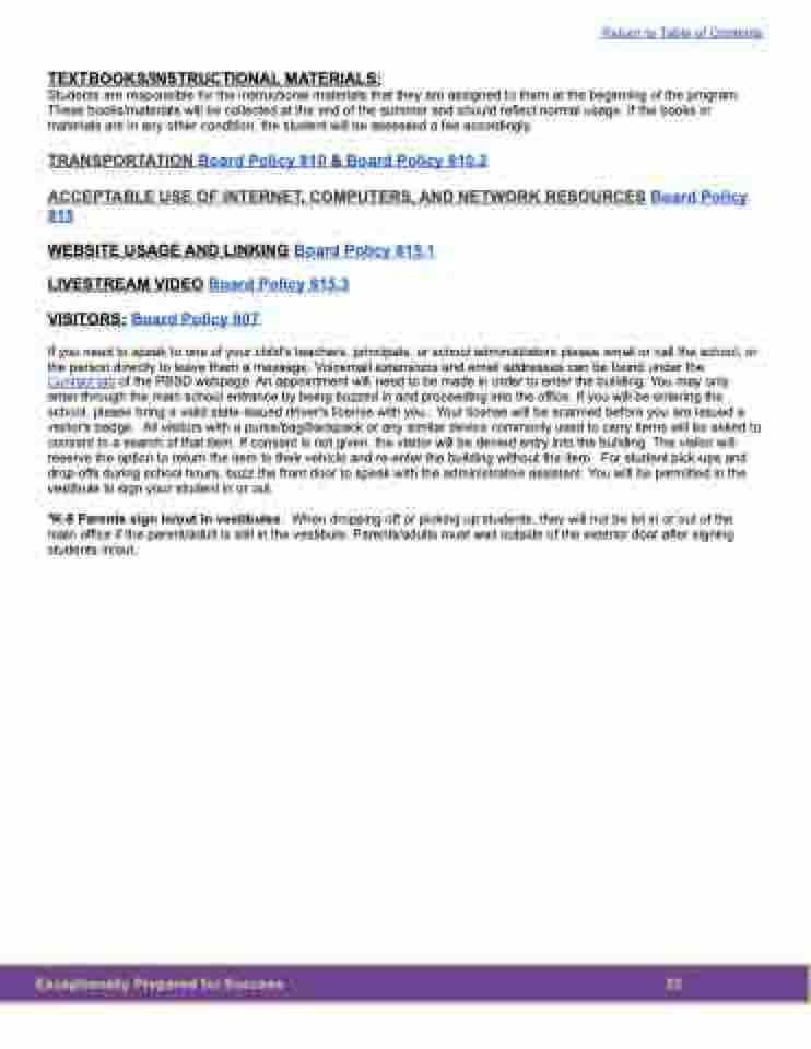 Contact tab of the PBSD webpage. An appointment will need to be made in order to enter the building. You may only enter through the main school entrance by being buzzed in and proceeding into the office. If you will be entering the school, please bring a valid state-issued driver's license with you. Your license will be scanned before you are issued a visitor's badge. All visitors with a purse/bag/backpack or any similar device commonly used to carry items will be asked to consent to a search of that item. If consent is not given, the visitor will be denied entry into the building. The visitor will reserve the option to return the item to their vehicle and re-enter the building without the item. For student pick-ups and drop-offs during school hours, buzz the front door to speak with the administrative assistant. You will be permitted in the vestibule to sign your student in or out.