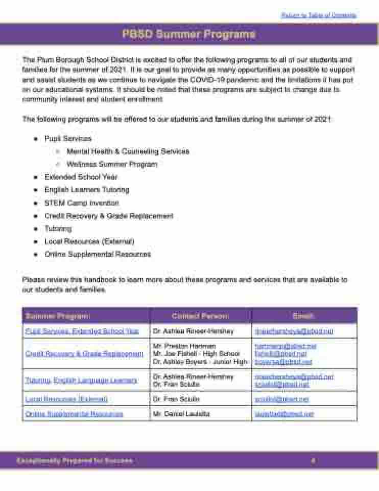 The Plum Borough School District is excited to offer the following programs to all of our students and families for the summer of 2021. It is our goal to provide as many opportunities as possible to support and assist students as we continue to navigate the COVID-19 pandemic and the limitations it has put on our educational systems. It should be noted that these programs are subject to change due to community interest and student enrollment.