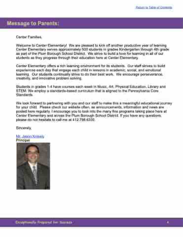 We look forward to partnering with you and our staff to make this a meaningful educational journey for your child. Please check our website often, as announcements, information and news are posted here regularly. I encourage you to look into the many fine programs taking place here at Center Elementary and across the Plum Borough School District. If you have any questions, please do not hesitate to call me at 412.798.6330.