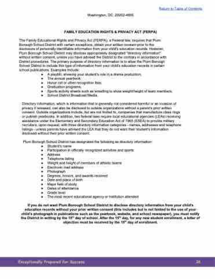 The Family Educational Rights and Privacy Act (FERPA), a Federal law, requires that Plum Borough School District with certain exceptions, obtain your written consent prior to the disclosure of personally identifiable information from your child's education records. However, Plum Borough School District may disclose appropriately designated "directory information" without written consent, unless you have advised the District to the contrary in accordance with District procedures. The primary purpose of directory information is to allow the Plum Borough School District to include this type of information from your child's education records in certain school publications. Examples Include: