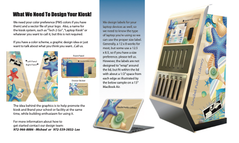 We need your color preference (PMS colors if you have them) and a vector file of your logo. Also, a name for the kiosk system, such as “Tech 2 Go” , “Laptop Kiosk” or whatever you want to call it, but this is not required.