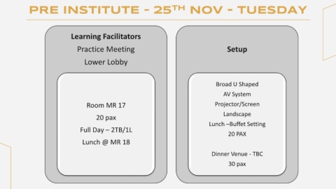PRE INSTITUTE – 25 TH NOV - TUESDAY Learning Facilitators Practice Meeting Setup Lower Lobby Broad U Shaped AV System Room MR 17 Projector/Screen Landscape 20 pax Lunch –Buffet Setting Full Day – 2TB/1L 20 PAX Lunch @ MR 18 Dinner Venue - TBC 30 pax