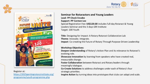 Special Registration Fee: US$120.00 includes full-day Rotaract & Young