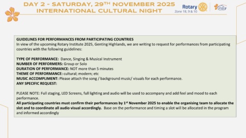 In view of the upcoming Rotary Institute 2025, Genting Highlands, we are writing to request for performances from participating