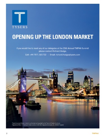 If you would like to meet any of our delegates at the 25th Annual TMPAA Summit please contact Richard Hodge. Cell: +44 7971 501732 | Email: richard.hodge@tysers.com 2 TMPAA