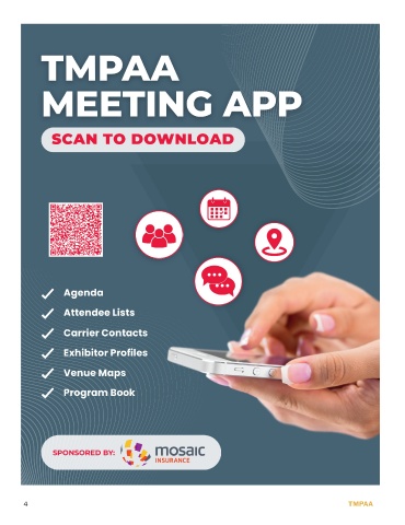 TMPAA MEETING APP SCAN TO DOWNLOAD Agenda Attendee Lists Carrier Contacts Exhibitor Profiles Venue Maps Program Book SPONSORED BY: 4 TMPAA
