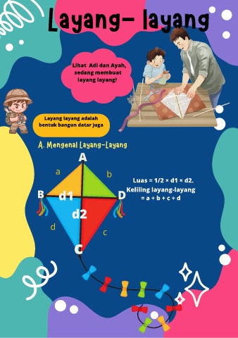 Layang- layang Lihat Adi dan Ayah, sedang membuat layang layang! Layang layang adalah bentuk bangun datar juga A. Mengenal Layang-Layang A a b Luas = 1/2 × d1 × d2. B d1 D Keliling layang-layang = a + b + c + d d2 d c c