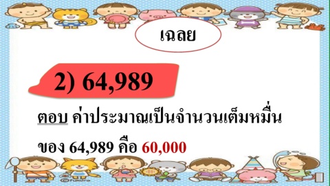 เฉลย 2) 64,989 ตอบ ค่ำประมำณเป็นจ ำนวนเต็มหมื่น ของ 64,989 คือ 60,000