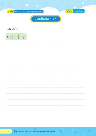 0 1 5 4 7 9 9 2 หน่วยที่ ๑ เศษส่วน และก�รบวก ก�รลบ ก�รคูณ ก�รห�รเศษส่วน ฝ.๑.๒๖/ผ.๒๖ แบบฝกหัด 1.26 แสดงวิธีทำ� 5 2 1 1. 1 6 – 9 + 2 ๖๖ 1 5 7 9 สถาบันสงเสริมการสอนวิทยาศาสตรและเทคโนโลยี (สสวท.) 6 4 2 0