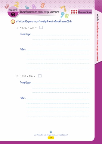ฝ.๑.๑๐/ผ.๑๐ 2. สร้างโจทย์ปัญหาจากประโยคสัญลักษณ์ พร้อมทั้งแสดงวิธีท�า 1) 42,310 × 225 = โจทย์ปัญหา วิธีท�า 2) 1,296 × 360 = โจทย์ปัญหา วิธีท�า ์ ส ถ า บั น ส ง เ ส ริ ม ก า ร ส อ น วิ ท ย า ศ า ส ต ร แ ล ะ เ ท ค โนโ ล ยี ( ส ส ว ท . ) ่ 19