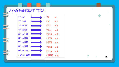 AKAR PANGKAT TIGA 1 3 = 1 = 1 2 3 = 8 = 2 3 3 = 27 = 3 4 3 = 64 = 4 5 3 = 125 = 5 6 3 = 216 = 6 7 3 = 343 = 7 8 3 = 512 = 8 9 3 = 729 = 9 3 10 = 1000 = 10 16