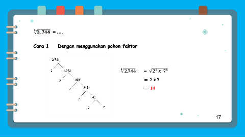 . = …. Cara 1 Dengan menggunakan pohon faktor 3 3 3 2.744 = 2 7 = 2 x 7 = 14 17