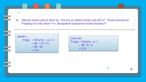 4). Sebuah kolam penuh terisi air. Volume air dalam Kolam ada 96 m . Kolam berukuran