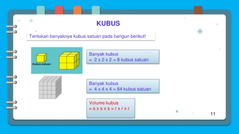 KUBUS Tentukan banyaknya kubus satuan pada bangun berikut! Banyak kubus = 2 x 2 x 2 = 8 kubus satuan Banyak kubus = 4 x 4 x 4 = 64 kubus satuan Volume kubus = s x s x s = r x r x r 11