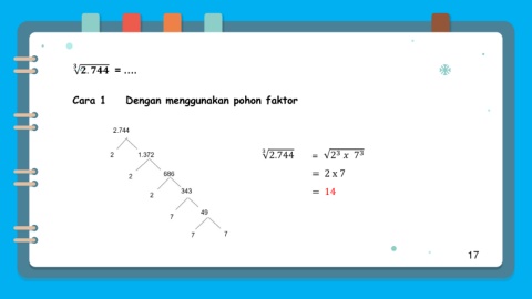 . = …. Cara 1 Dengan menggunakan pohon faktor 3 3 3 2.744 = 2 7 = 2 x 7 = 14 17