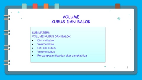 VOLUME KUBUS DAN BALOK SUB MATERI: VOLUME KUBUS DAN BALOK Ciri- ciri balok Volume balok Ciri- ciri kubus Volume kubus Perpangkatan tiga dan akar pangkat tiga 1