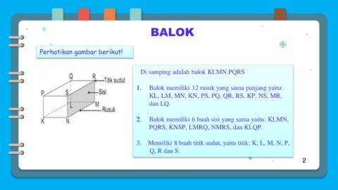 1. Balok memiliki 12 rusuk yang sama panjang yaitu: